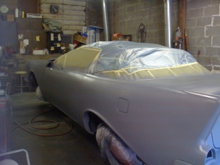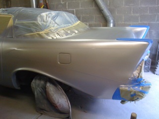 I am going to the paint shop each day to complete all the maskng to prepare the car so the painter can apply each color. First the entire car was painted with an epoxy sealer. This revealed a couple areas on the body that needed a bit more attention.